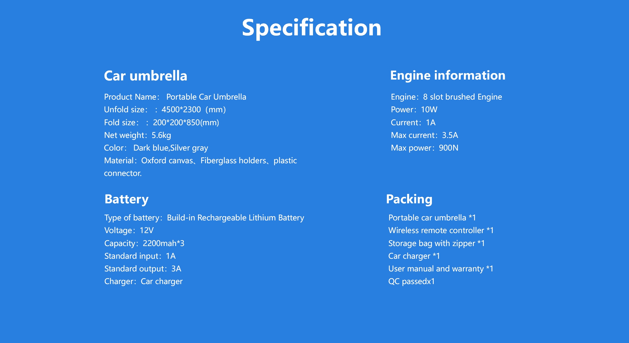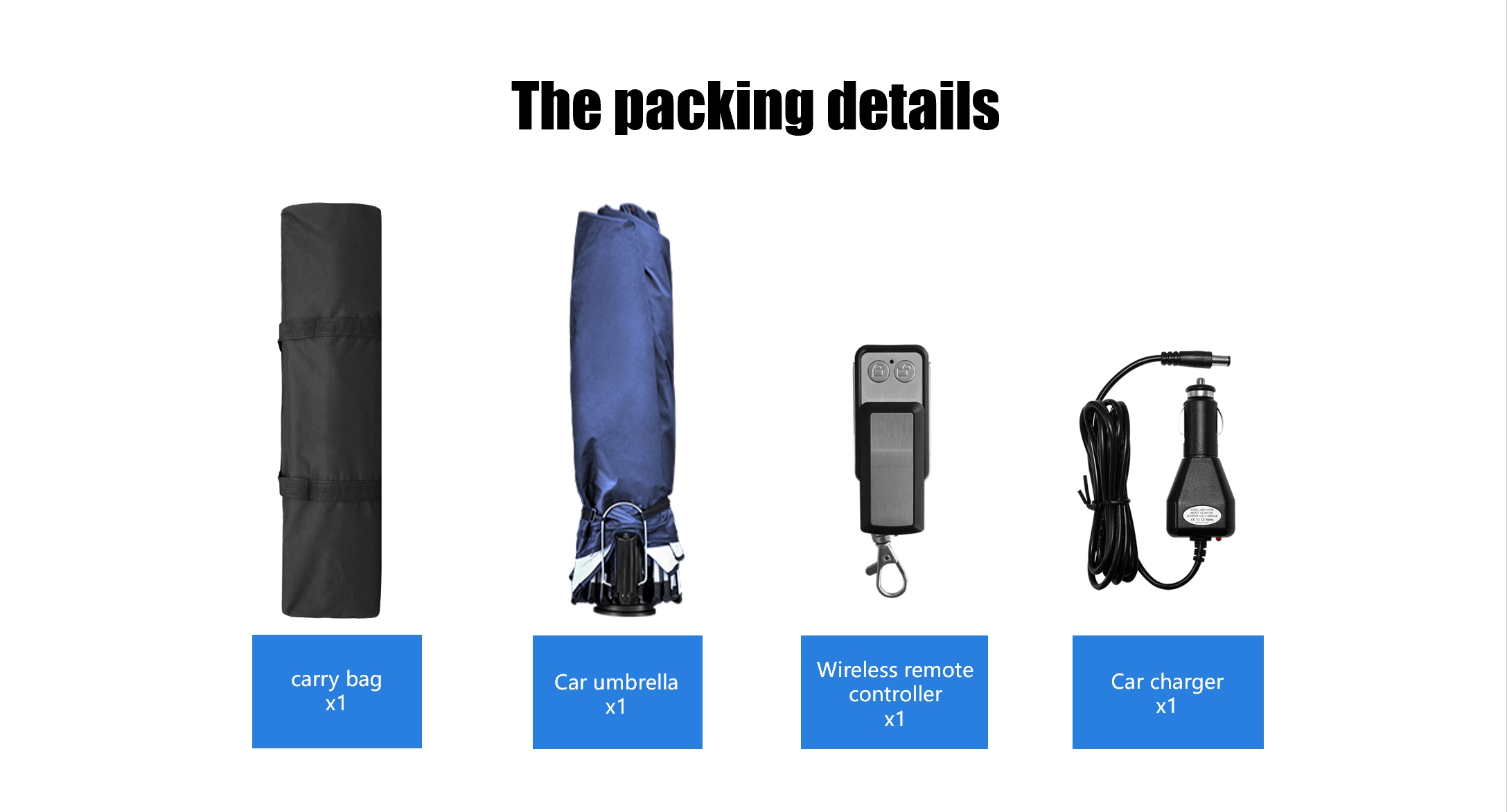 | Αξεσουάρ | Φορητή ομπρέλα αυτοκινήτου x 1, Τσάντα αποθήκευσης με φερμουάρ x1, Εγχειρίδιο χρήστη και κάρτα εγγύησης x1 . |